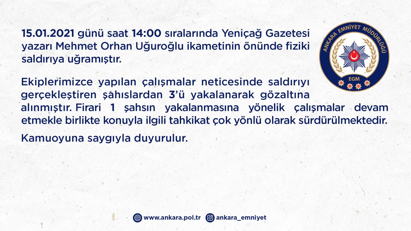 Ankara Emniyet Müdürlüğü’nden Orhan Uğuroğlu’na yönelik saldırıya ilişkin bir açıklama yapıldı. Açıklamada “Saldırıyı gerçekleştiren şahıslardan 3’ü yakalanarak gözaltına alınmıştır. Firari 1 şahsın yakalanmasına yönelik çalışmalar sürüyor” denildi.