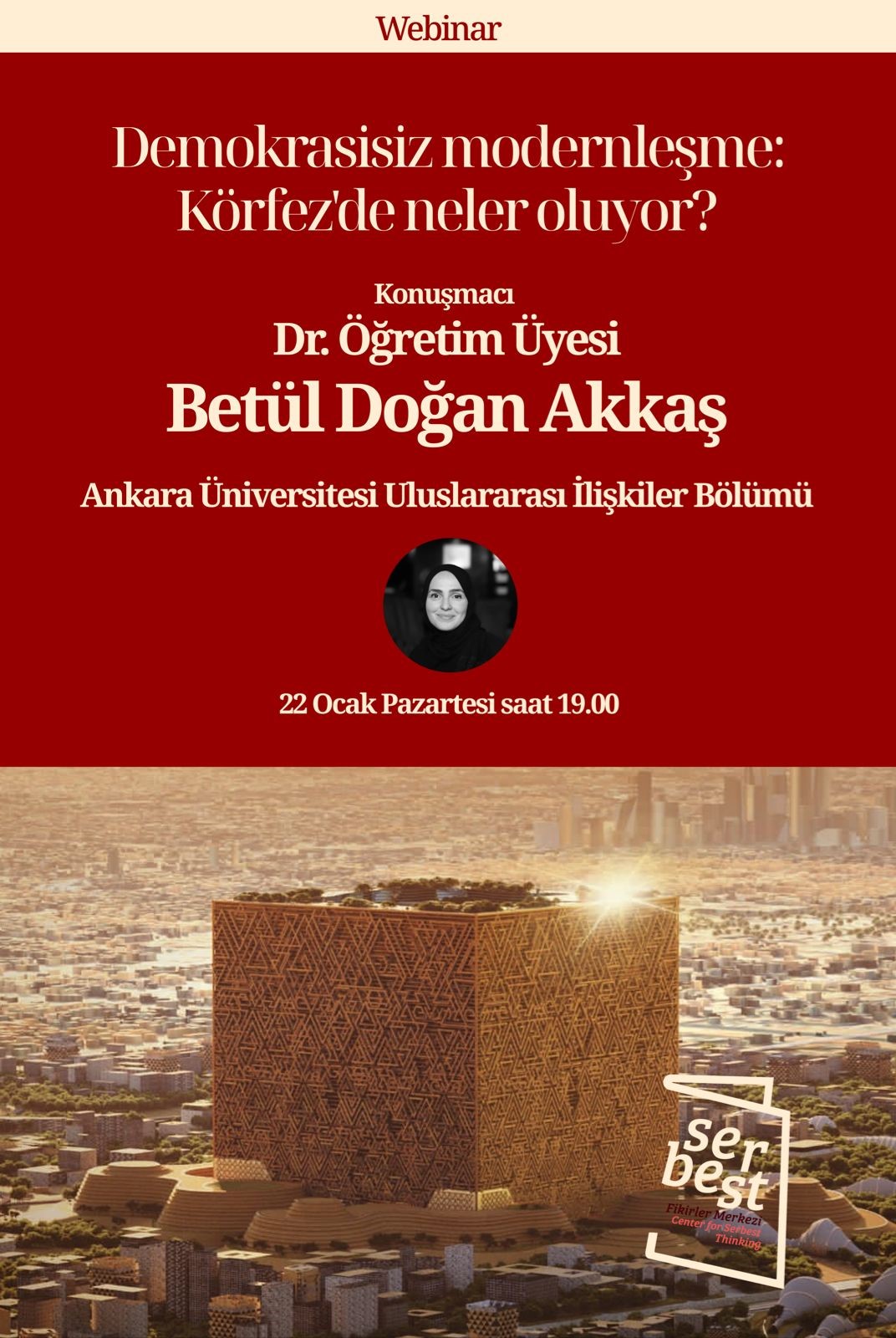 Serbest Fikirler Merkezi’nin bu ayki açık Webinar oturumunda Ankara Üniversitesi Uluslararası İlişkiler Bölümü’nden Dr. Betül Doğan Akkaş, Körfez ülkelerindeki otoriter modernleşme tecrübesini anlatıyor: