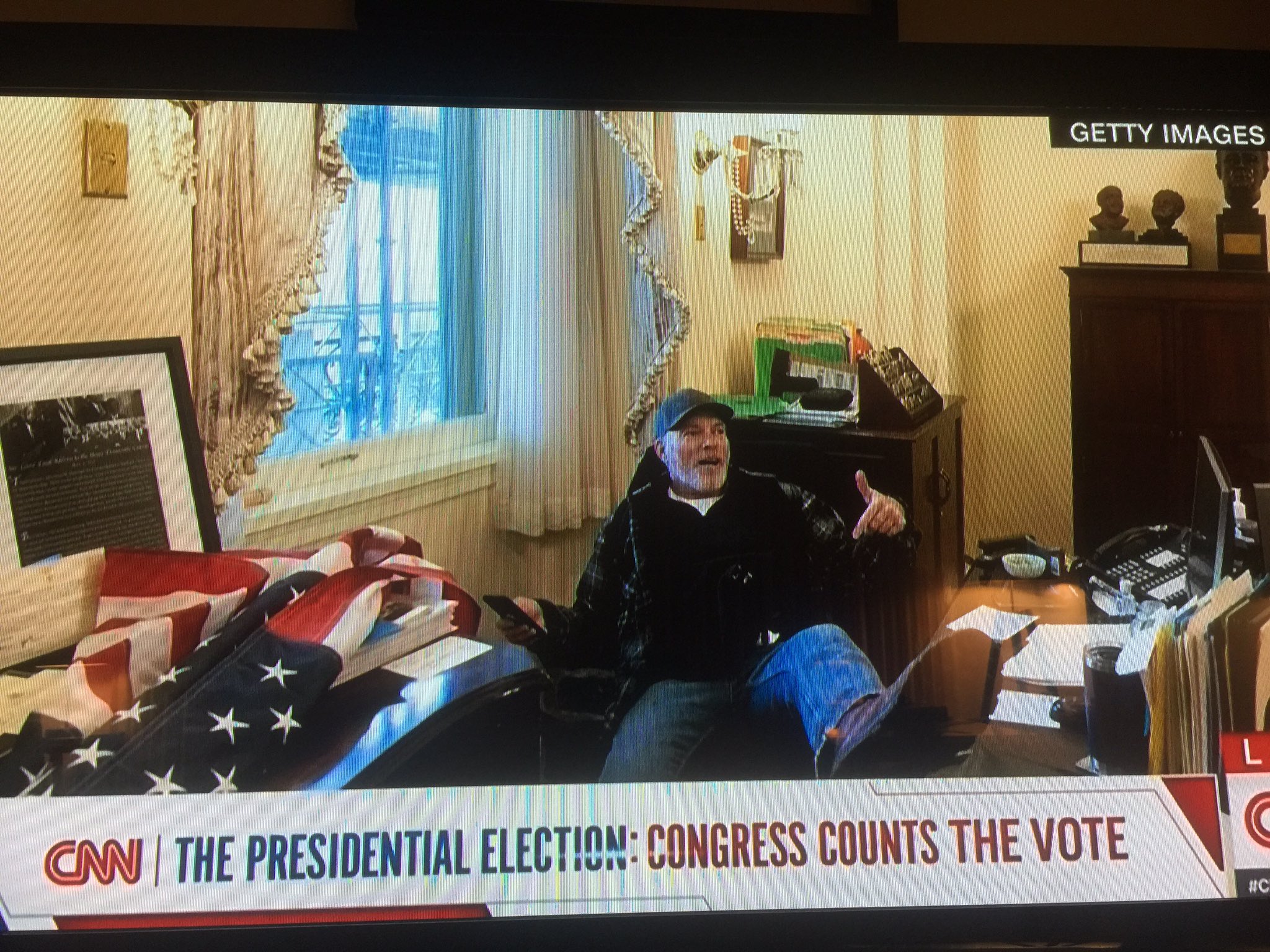 23.59 | Kongre binasına giren Trump taraftarları Temsilciler Meclisi’nin Demokrat Sözcüsü Nancy Pelosi’nin ofisine girdi. Bir gösterici Pelosi’nin koltuğuna oturdu. Masasına “Geri adım atmayacağız” mesajı bıraktı.