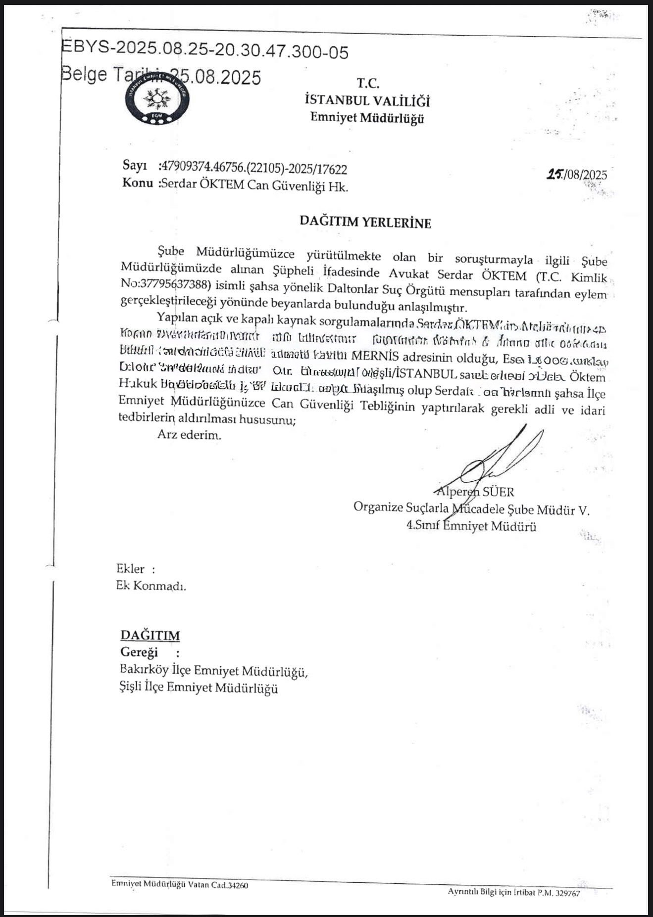 Suikastla öldürülen avukat Serdar Öktem’in 2 ay önce, Daltonlar suç örgütünün kendisine saldıracağını Emniyet’e bildirdiği evrak ortaya çıktı.
