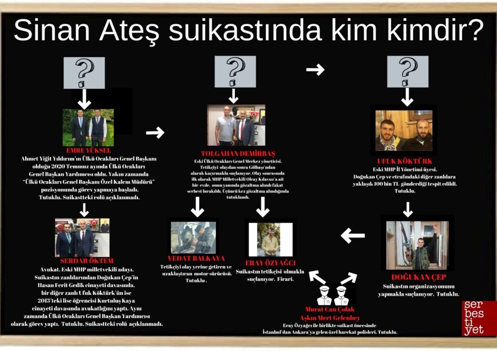 Üzerinden dört hafta geçen Sinan Ateş cinayeti soruşturmasında tutuklananların sayısı 18’e ulaştı. Tutuklanan isimler arasında Ülkü Ocakları Genel Başkan Yardımcılığı yapan, bir süredir Ülkü Ocakları Genel Başkan Yardımcısı Özel Kalem Müdürü pozisyonunda görev yapan Emre Yücel, MHP’den milletvekili adayı olan avukat Serdar Öktem, Ülkü Ocakları Genel Merkez yöneticiliği yapan Tolgahan Demirbaş, MHP İstanbul İl Yöneticisi Ufuk Köktürk, iki özel harekat polisi ve uyuşturucu sabıkalı isimler var.