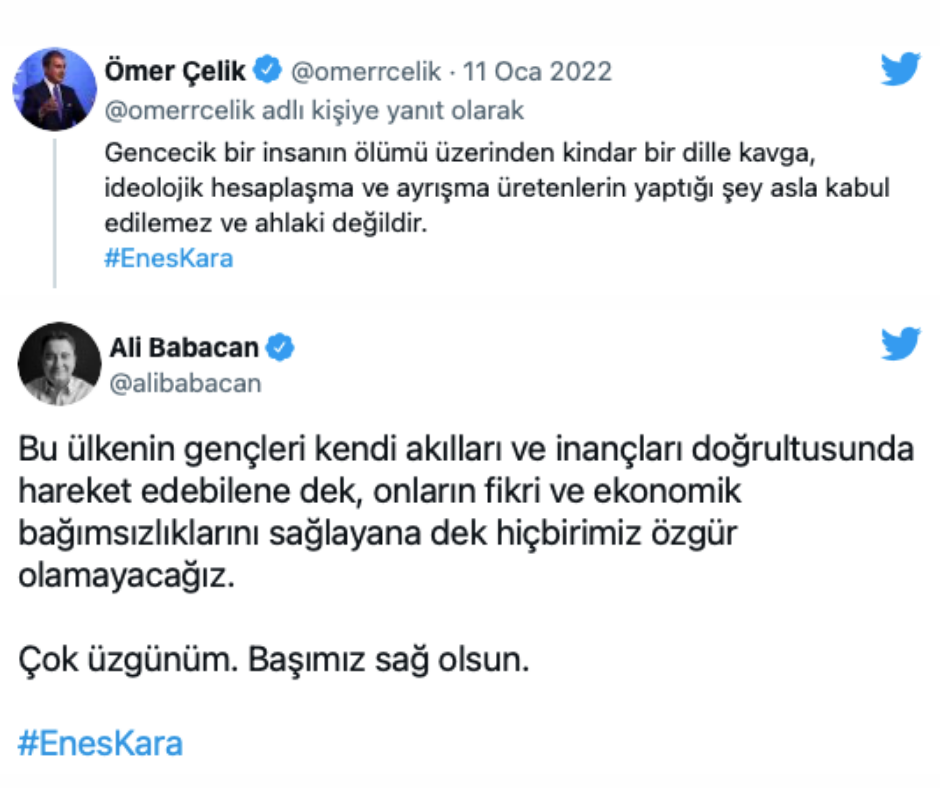 DEVA Partisi Genel Başkanı Ali Babacan sosyal medya hesabından, “Bu ülkenin gençleri kendi akılları ve inançları doğrultusunda hareket edebilene dek, onların fikri ve ekonomik bağımsızlıklarını sağlayana dek hiçbirimiz özgür olamayacağız. Çok üzgünüm. Başımız sağ olsun” mesajını paylaştı.