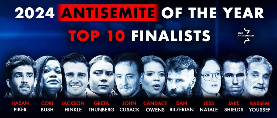 ABD merkezli ‘Antisemitizm’i Durdur’ isimli Siyonist girişim ‘Yılın Antisemiti’ni seçtikleri bir oylama yapıyor. Seçim için seçtikleri adaylar Filistin destekçisi ünlü isimlerden oluşuyor. Seçtikleri adaylar: