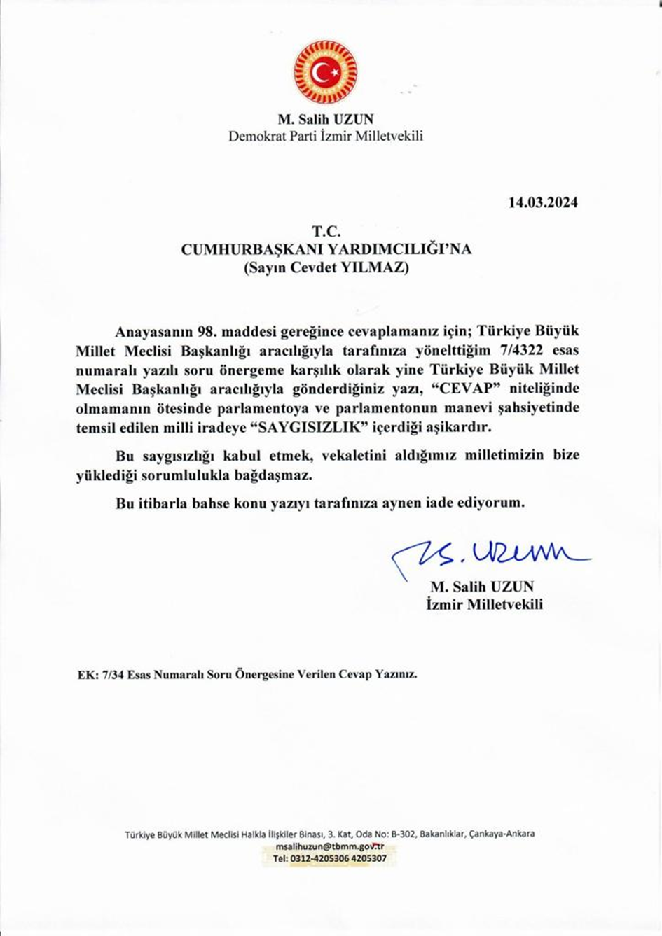 Yılmaz’dan gelen “yeteri kadar” yanıtının Cumhurbaşkanlığı Hükümet Sistemi’nde parlamentonun güçsüzleştirilmesinin, denetim yetkisinin sınırlandırılmasının, keyfi uygulamaların somut göstergesi olduğunu düşünen Salih Uzun, Cevdet Yılmaz’a “Bu saygısızlığı kabul etmek, vekaletini aldığımız milletin bize yüklediği sorumlulukla bağdaşmaz” mesajıyla yazı yazdı ve soru önergesine yanıtı iade etti.