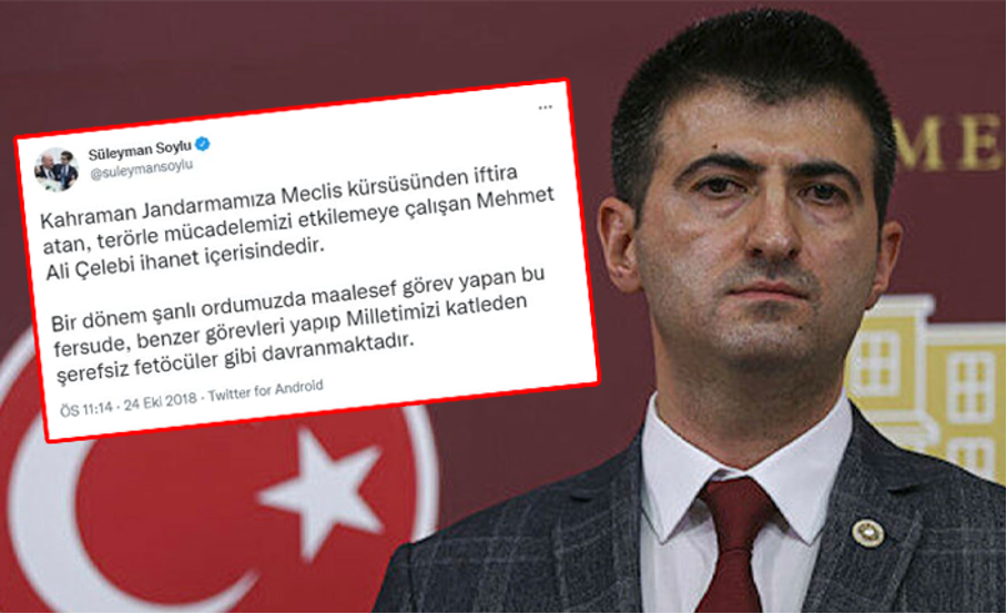 Soylu, o tarihte yaptığı paylaşımda Çelebi’nin ihanet içerisinde olduğunu söyleyerek “Kahraman Jandarmamıza Meclis kürsüsünden iftira atan, terörle mücadelemizi etkilemeye çalışan Mehmet Ali Çelebi ihanet içerisindedir. Bir dönem şanlı ordumuzda maalesef görev yapan bu fersude, benzer görevleri yapıp Milletimizi katleden şerefsiz fetöcüler gibi davranmaktadır” demişti.