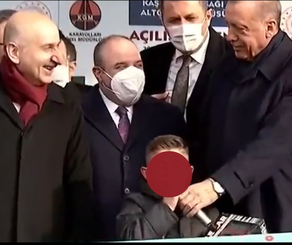 Mitingin görüntülerinde, küçük çocuğun Erdoğan’ın yanına yaklaştığı anlarda İçişleri Bakanı Süleyman Soylu’nun Erdoğan’a yaklaşarak, “Mecliste çalışan Konyalı Kemalettin A. var ya, bu onun torunu” dediği duyuluyor.