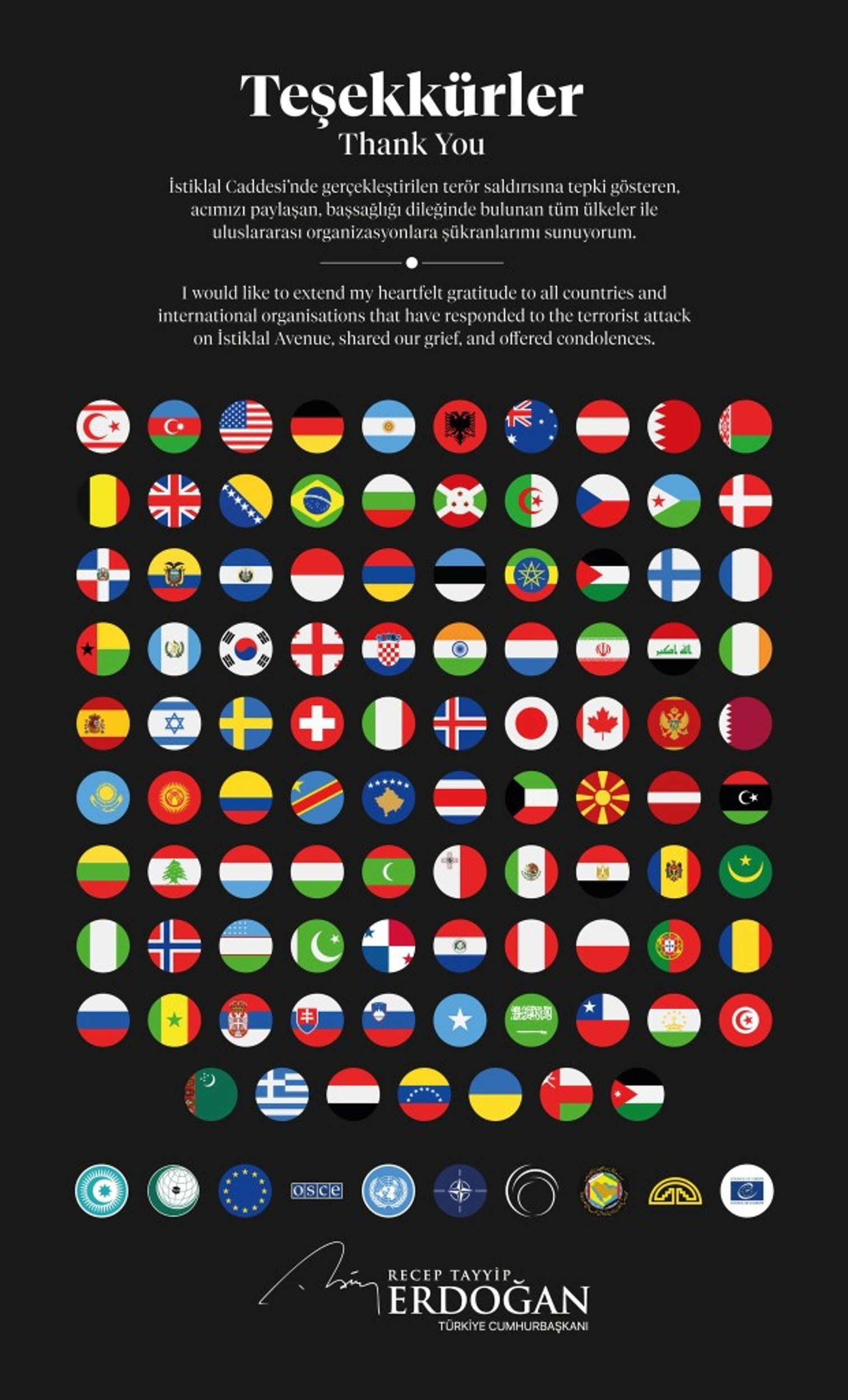 Cumhurbaşkanı Erdoğan ise bugün (15 Kasım) Twitter hesabından yaptığı bir paylaşım ile, saldırının ardından Türkiye’ye taziye ileten ülkelere ve uluslararası organizasyonlara teşekkür etti.