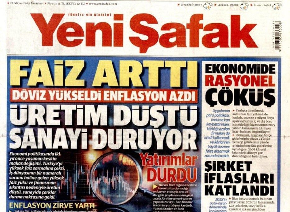 Birinci sayfa manşette büyük puntoyla “Faiz arttı, döviz yükseldi, enflasyon azdı, üretim düştü, sanayi duruyor” başlığı atan Yeni Şafak’ın manşet haberinde şu bölümler yer aldı: