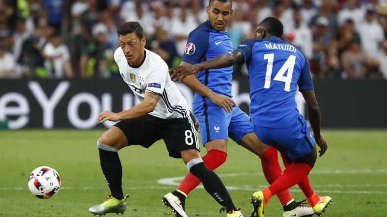 45. dakikada Fransa penaltı kazandı. Yapılan ortada Evra'nın kafa vuruşu Schweinsteiger'in eline çarptı ve hakem penaltı noktasını gösterdi. Topun başına geçen Griezmann topu filelere gönderdi. Fransa 1-0 öne geçti.