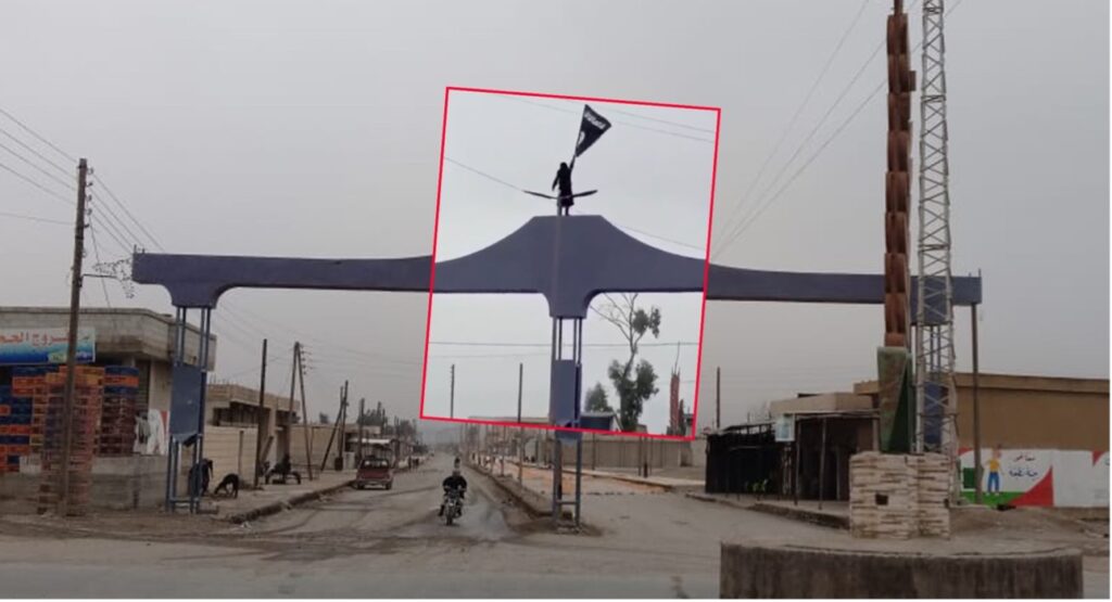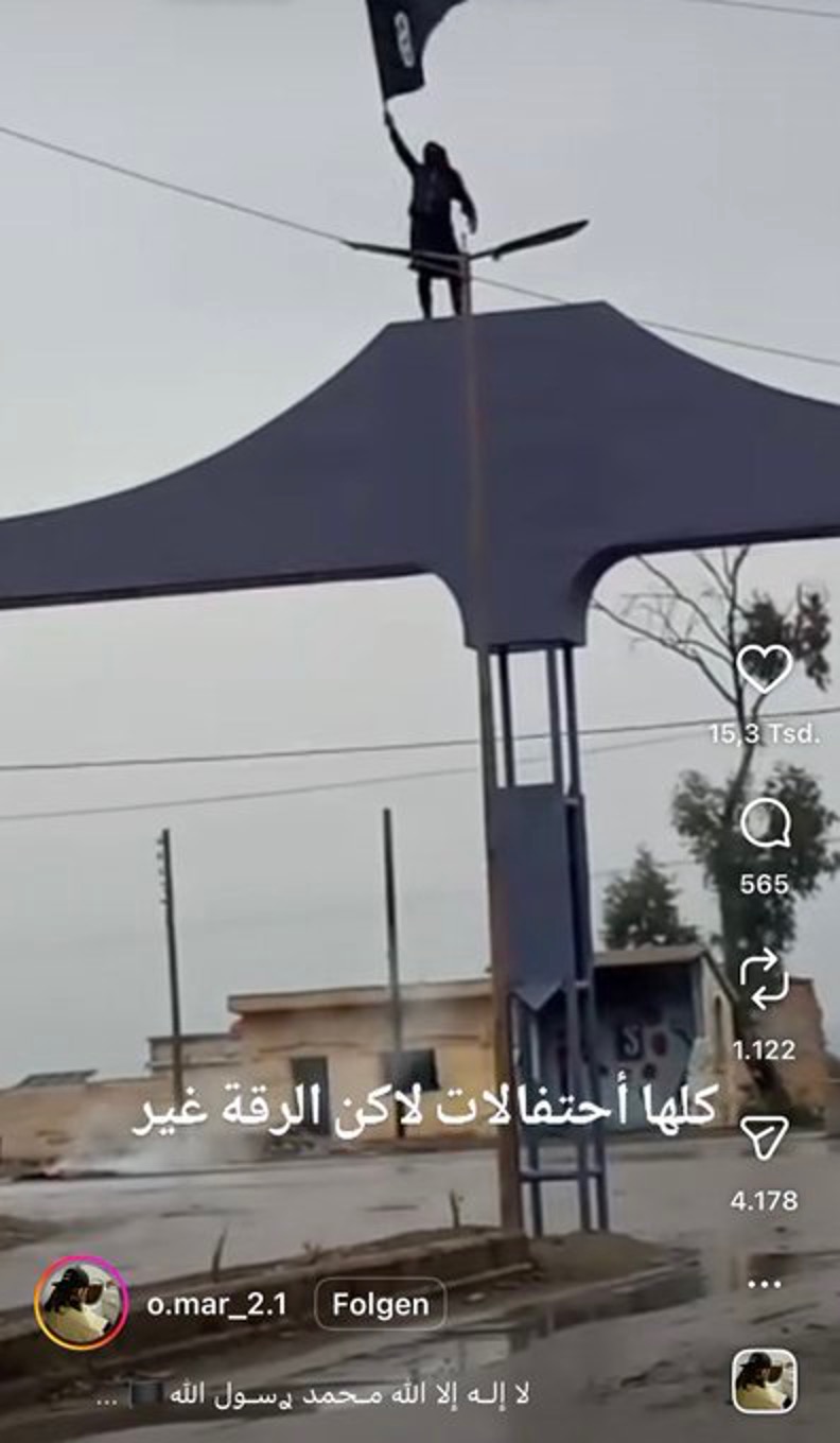 Arapça, İngilizce ve İbranice yayın yapan hesaplar, sayfalar ve haber siteleri; Rakka kırsalındaki Kerame beldesinin girişinde, IŞİD’in bayrak olarak kullandığı Hz. Muhammed’in “Ukab Sancağı”nı (siyah bayrak) kaldıran birini gösteren bir video paylaştı.