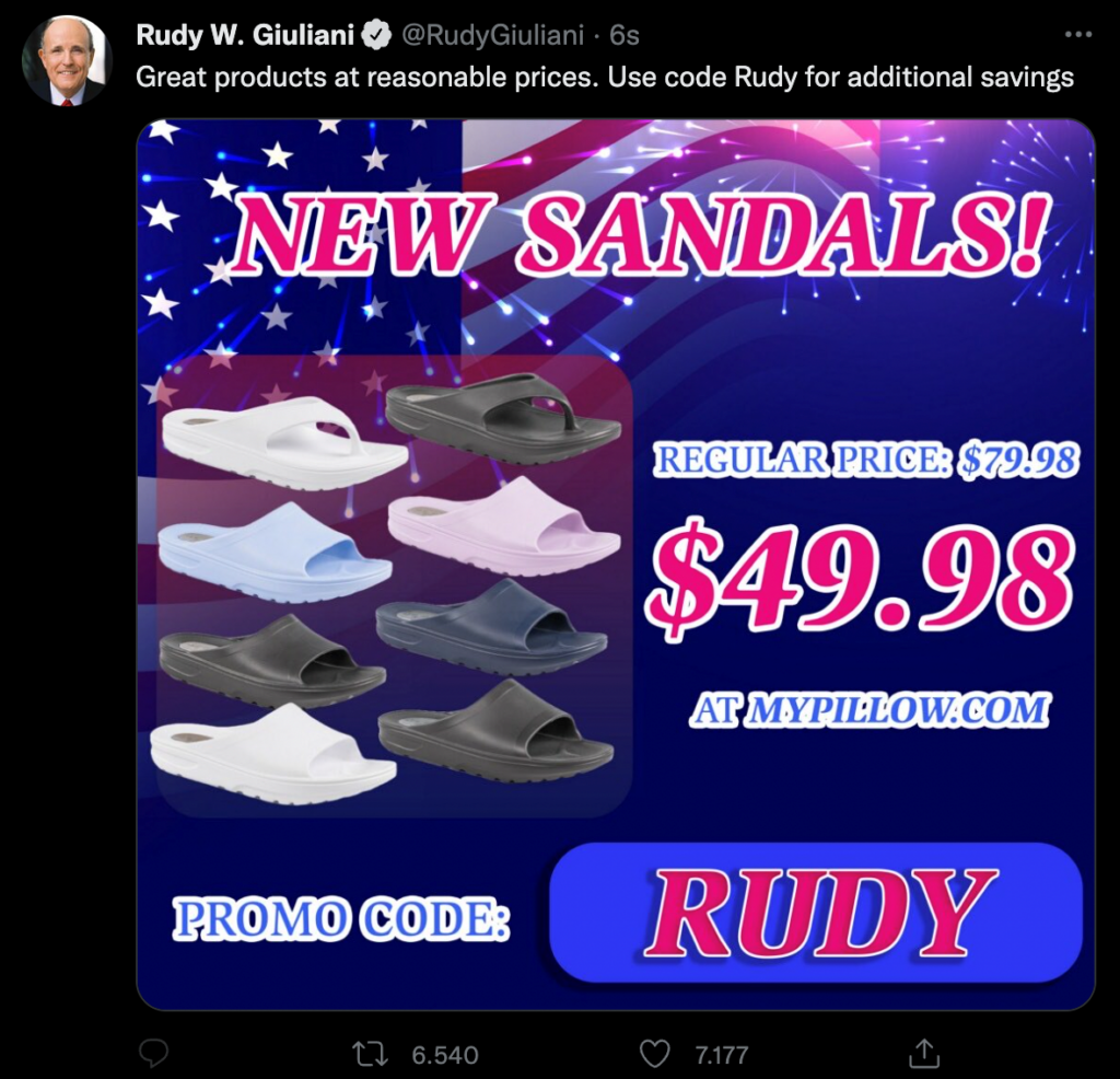 New York’un eski belediye başkanı, Trump’ın şahsi avukatlarından ve en yakın müttefiklerinden Rudy Giuliani, Twitter hesabından paylaştığı terlik reklamında takipçilerine özel indirim kodu verdi ve terlik reklamı paylaştı. Giuliani’nin paylaştığı indirim kodu kendi ismini taşıyor: “Rudy.” Giuliani’nin paylaşımı sosyal medyada dalga konusu oldu.