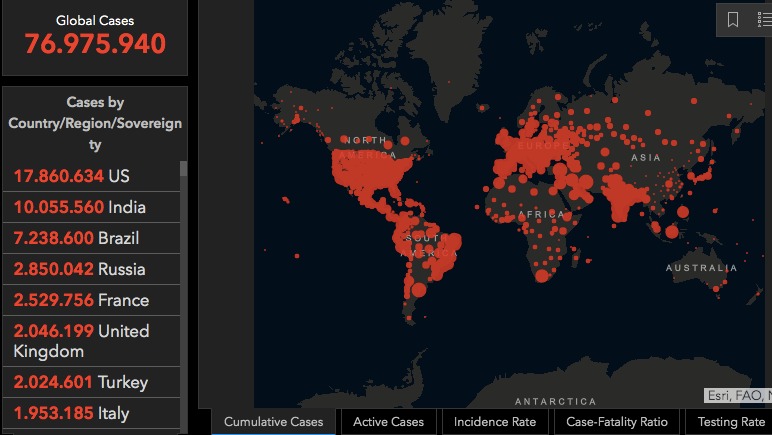 John Hopkins Üniversitesi’nin hazırladığı, tek tek ülkelerde vaka sayılarını, ölümleri, ölüm oranlarını ve yüz bin kişiye düşen ölümleri gösteren tablo: