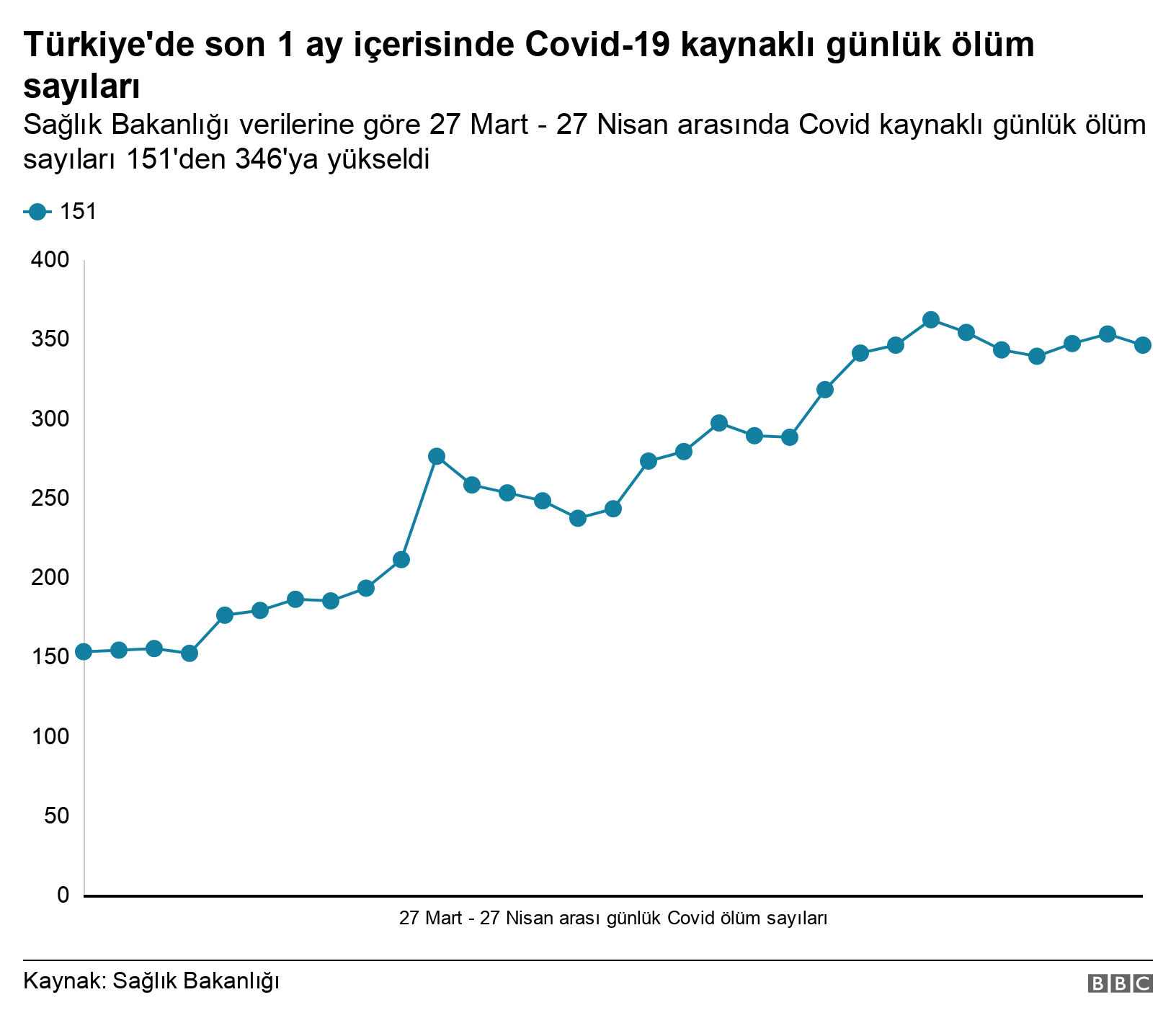 Türkiye’de son 1 ay içerisinde Covid-19 kaynaklı günlük ölüm sayıları. Sağlık Bakanlığı verilerine göre 27 Mart – 27 Nisan arasında Covid kaynaklı günlük ölüm sayıları 151’den 346’ya yükseldi. .