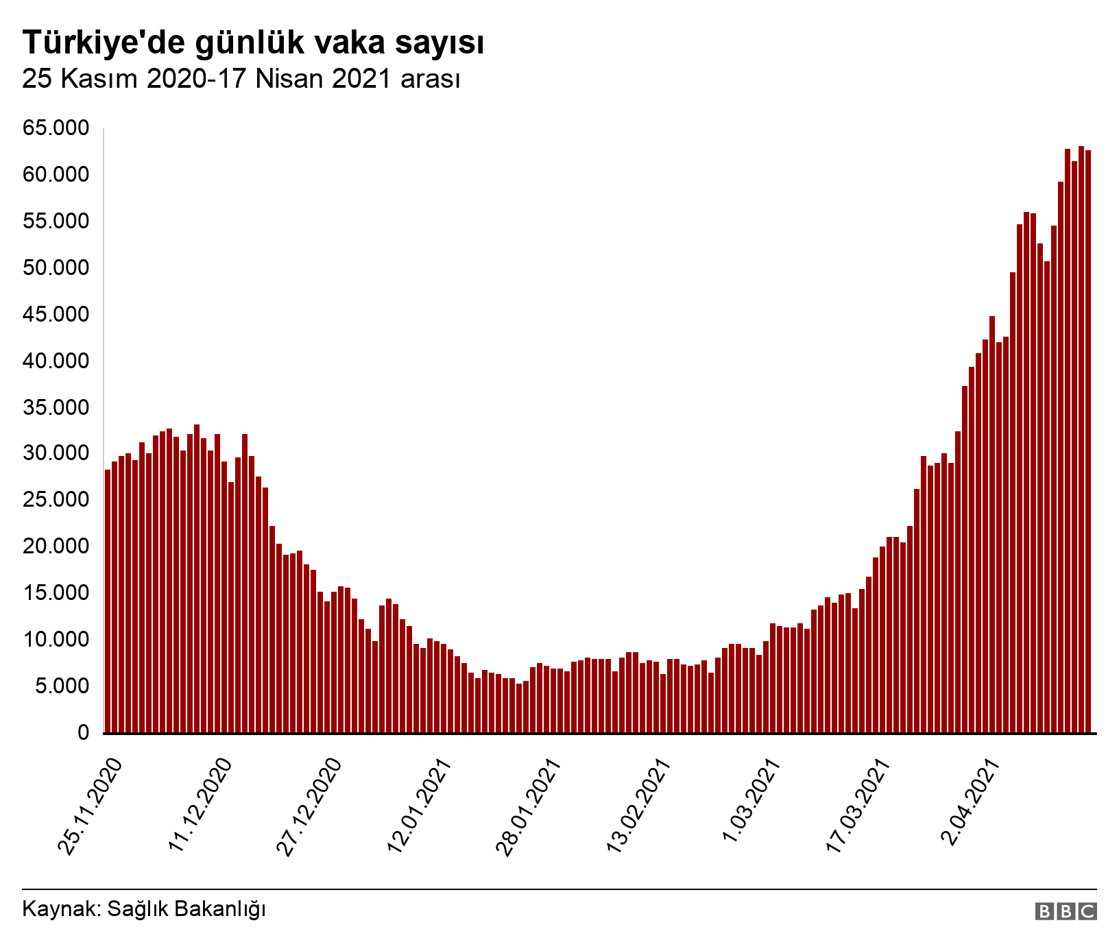 Türkiye’de Mart ayıyla birlikte virüs yeniden hızlı bir şekilde yayılmaya başlarken günlük vaka sayısı 7 Nisan’dan sonra 50 binin üzerinde seyretmeye başlamıştı. Türkiye, 12-18 Nisan haftası 4 gün üst üste 60 binin üzerinde vaka açıklamıştı.