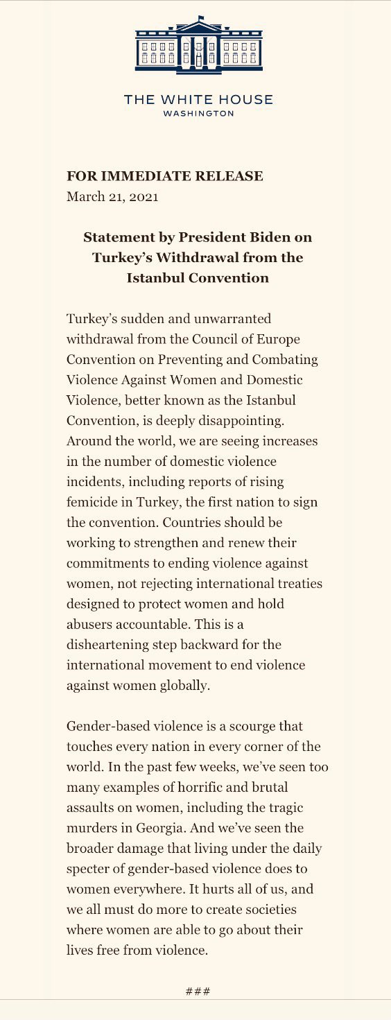 ABD Başkanı Joe Biden, Türkiye’nin ilk imzacısı olduğu İstanbul Sözleşmesi’nden çekilme kararı alması hakkında yazılı bir açıklama yaptı.