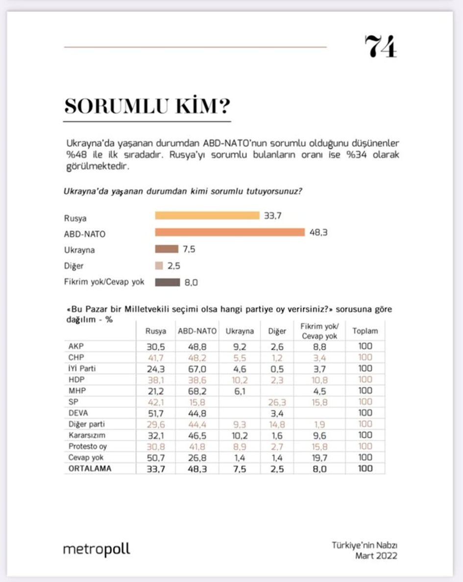 Ukrayna’da yaşananların sorumluluğunu ABD ve NATO’ya yükleyenlerin en yüksek oranda olduğu partiler MHP ve İYİ Parti.