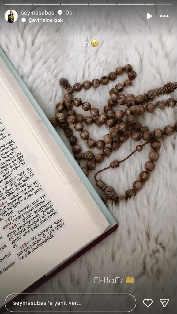 Şeyma Subaşı, hakkında uyuşturucu soruşturması kapsamında yakalama kararı çıkartılması sonrası Instagram hesabından Kuran sayfaları ve tespih fotoğrafı paylaşmıştı.