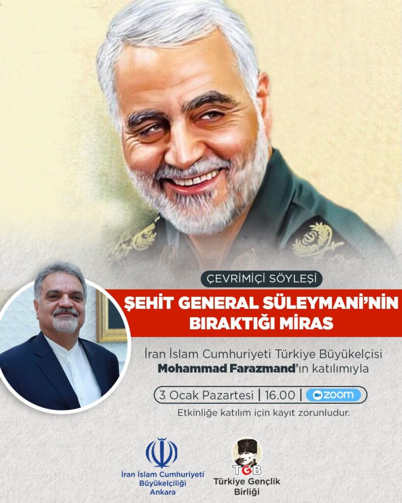 TGB’nin İran İslam Cumhuriyeti Ankara Büyükelçiliği ile ortak düzenlediği “Şehit General Süleymani’nin Bıraktığı Miras” başlıklı çevrimici söyleşiye konuşmacı olarak İran’ın Ankara Büyükelçisi Mohammad Farazmand katılacak.