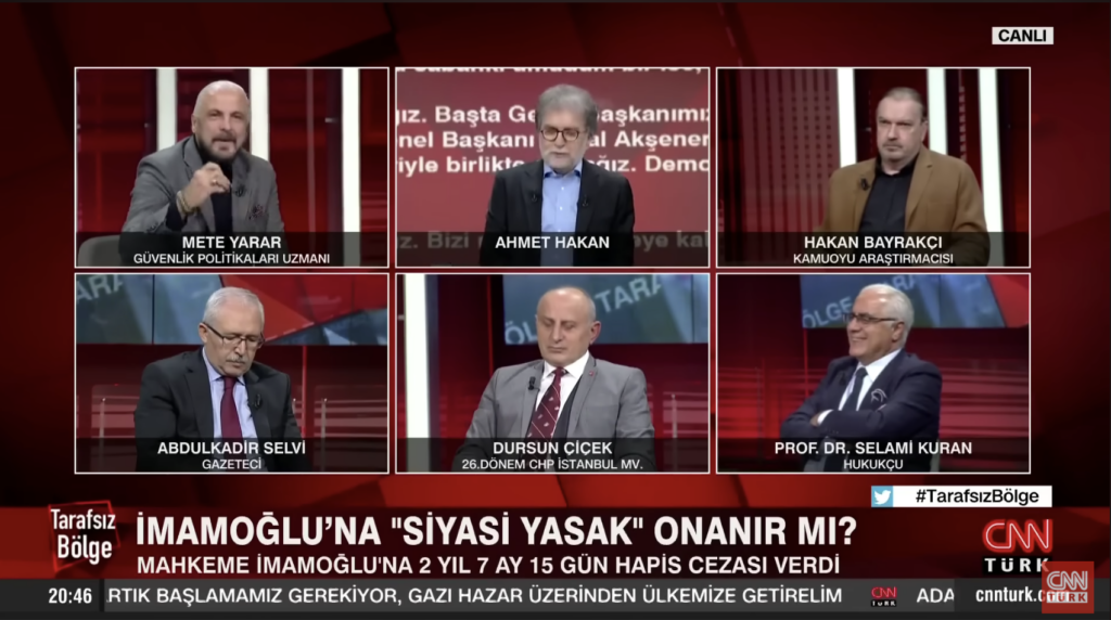 CNN Türk'te yayınlanan Ahmet Hakan ile Tarafsız Bölge programında İBB Başkanı Ekrem İmamoğlu'na verilen ceza ve siyasi yasak kararı eleştirildi. Prof. Dr. Selami Kuran: "Vatandaşın adalete olan güveni sarsıldıysa ciddi sıkıntı vardır", Mete Yarar: "Dava bile açılmaması gereken bir süreçten böyle bir karar çıktı", Ahmet Hakan: "Ben duysam 'saçmalık' derdim bu karara."