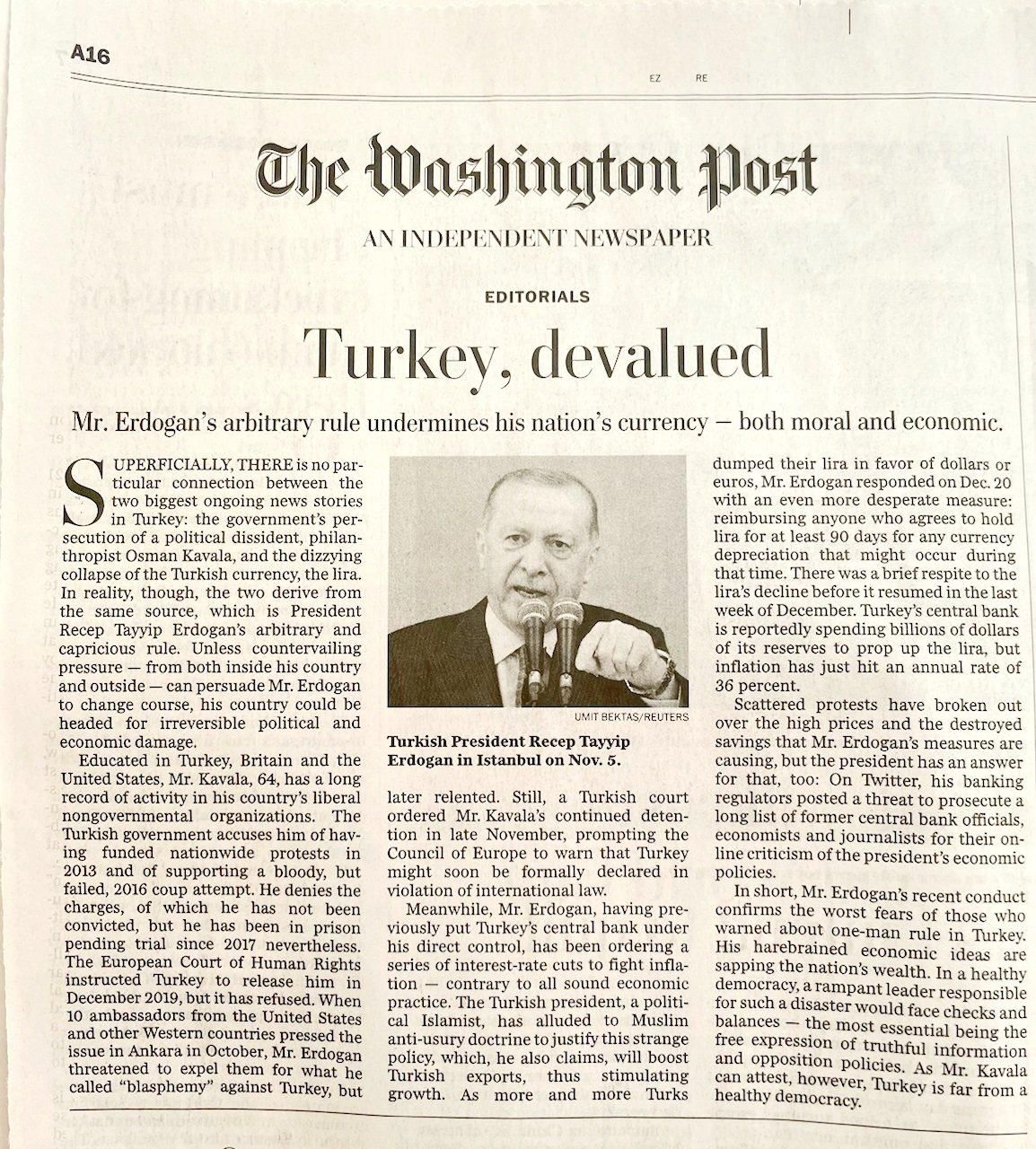 The Washington Post, Türkiye ekonomisinin durumu ile Osman Kavala’nın dört yılı aşkın tutukluluğunun birlikte mütalaa edilmesi gerektiğini ele alan bir editoryal yorum yayımladı.