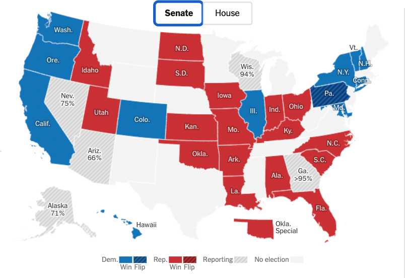 Temsilciler Meclisi seçimlerinde kesin sonuçlar için özellikle Batı Amerika’daki seçim sonuçlarının kesinleşmesi gerekiyor. Tahminlere göre, Cumhuriyetçiler birkaç vekil farkıyla çoğunluğu elde edecek gibi gözüküyor. Anket tahminlerinde bu farkın 15-20 olması bekleniyordu.