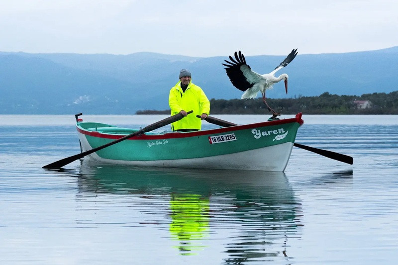 Her yıl göçten dönüp balıkçı Adem Yılmaz’ın kayığına giden leylek Yaren, 15’inci kez yine Adem Yılmaz’la buluştu.