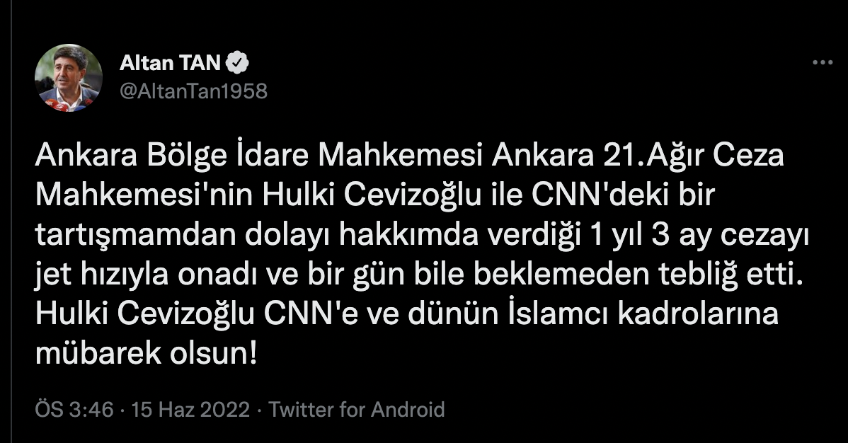 “Ankara Bölge İdare Mahkemesi Ankara 21.Ağır Ceza Mahkemesi’nin Hulki Cevizoğlu ile CNN’deki bir tartışmamdan dolayı hakkımda verdiği 1 yıl 3 ay cezayı jet hızıyla onadı ve bir gün bile beklemeden tebliğ etti. Hulki Cevizoğlu’na, CNN’e ve dünün İslamcı kadrolarına mübarek olsun!”
