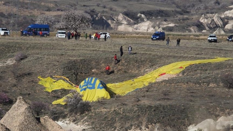 Nevşehir'in Kapadokya bölgesinde turistleri taşıyan sıcak hava balonları sabah Göreme beldesi yakınlarından havalandı. Balonlardan biri, Ortahisar beldesi yakınlarında inişe geçtiği sırada elektrik direğine takılarak düştü.