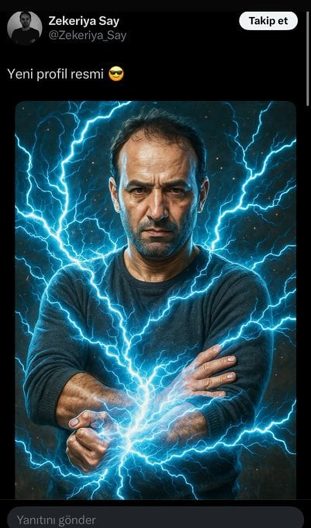 Say, önce X hesabındaki profil fotoğrafını elektrik akımı görseli olan bir profil fotoğrafı paylaştı. Tepkiler üzerine bir süre sonra paylaşımı kaldıran Say, “Tamam kabul ediyorum… Yapay zekanın hazırladığı resim zamansız. O yüzden sildim” mesajı paylaştı.