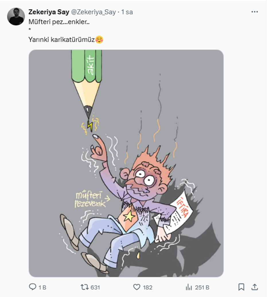 Say, daha sonra ise Akit yazılı bir kaleme dokunması sonucu elektrik akımına kapılan bir kişinin görüldüğü bir karikatürü, “Müfteri pez…enkler… Yarınki karikatürümüz” mesajıyla paylaştı.
