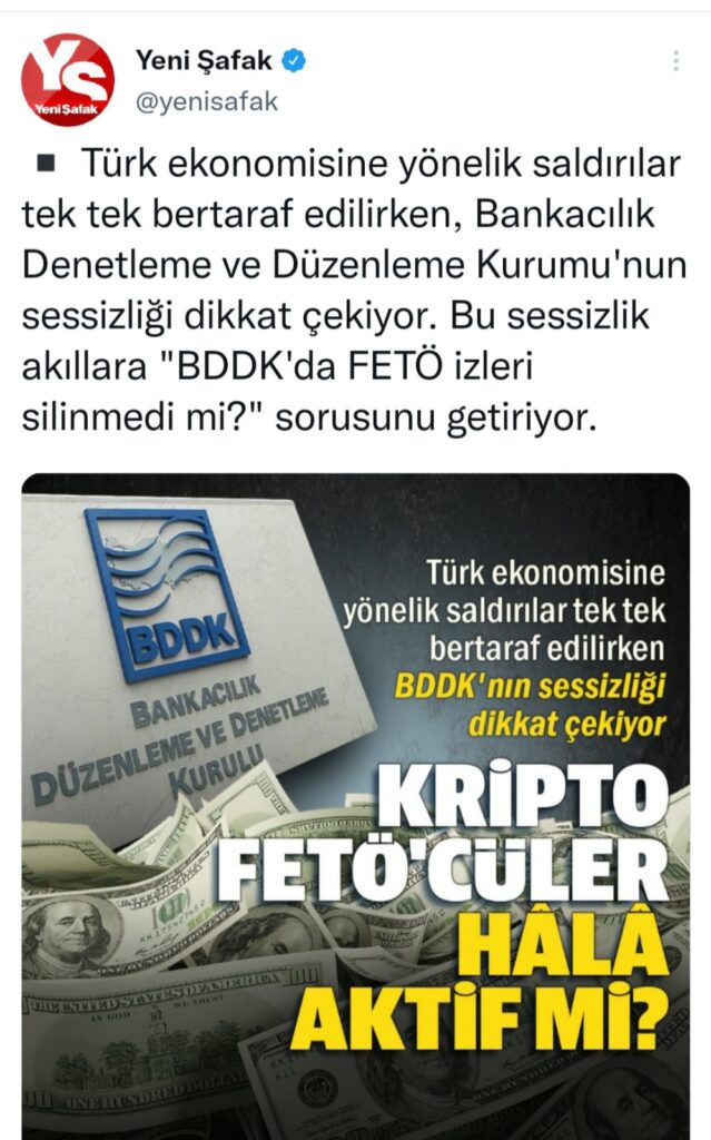 Yeni Şafak haberi sosyal medya hesabında “Kripto FETÖ’cüler hala aktif mi” yazılı bir görselle duyurdu.