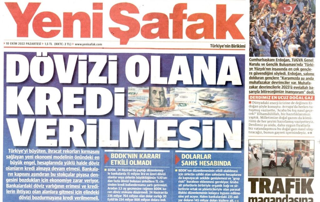 15 Ağustos’ta “Döviz stokçularına kredi verilmezse faiz, dolar ve enflasyon düşer” manşetiyle çıkan Yeni Şafak, BDDK’nın 24 Haziran tarihli kararının döviz stokçularını koruduğunu ileri sürmüştü.