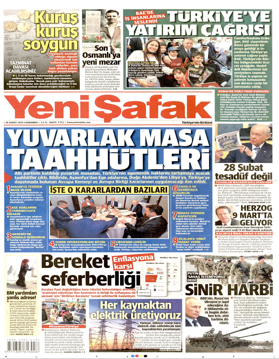 “Ankara’da CHP öncülüğünde bir araya gelen 6 partinin ‘yuvarlak masa’ toplantısından Türkiye’nin egemenlik haklarını tartışmaya açacak taahhütler çıktı. 6 partinin yayınladığı bildiride, Ayasofya’dan, Ege adalarına, Doğu Akdeniz’den Libya’ya kadar Türkiye’ye birçok konuda dayatmada bulunan Avrupa Konseyi ve Avrupa Birliği kararlarının uygulanacağı ilan edildi.