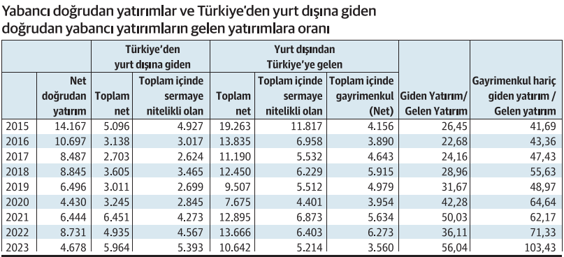 Giden yatırımın, gelen yatırıma oranına bakıldığında da 2023 sonu itibariyle giden yatırım, gelen yatırımın yüzde 103,43’üne çıktı. Diğer yandan, gayrimenkulden gelen yabancı doğrudan yatırımlar da darbe yılı hariç son yılların en düşük seviyelerinden birine geriledi.