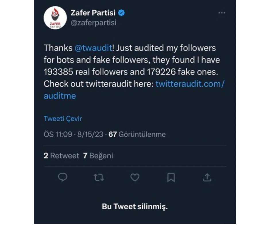 Twitter hesaplarındaki sahte takipçi sayısını gösterdiğini öne süren TwitterAudit adlı internet sitesinden Twitter hesabı için takipçi analizi yaptıran Zafer Partisi, 179.226 takipçisinin sahte hesap olduğunu gösteren sonucu yanlışlıkla Twitter hesabından paylaştı. Bu sayı Zafer Partisi’nin toplam takipçi sayısının yaklaşık yarısına karşılık geliyor.