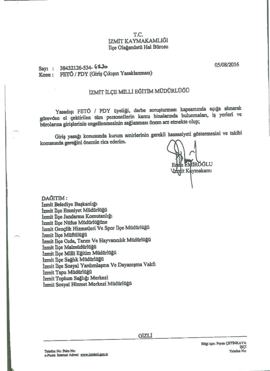 5 Ağustos 2016 tarihinde İzmit Kaymakamı gizli bir belgeyle İzmir’deki müdürlüklere FETÖ/PDY’den açığa alınanlar ve darbe soruşturmasından açığa alınanlar kamu binalarına, bürolara, iş yerlerine girmemeli şeklinde bir yazı göndermiş.