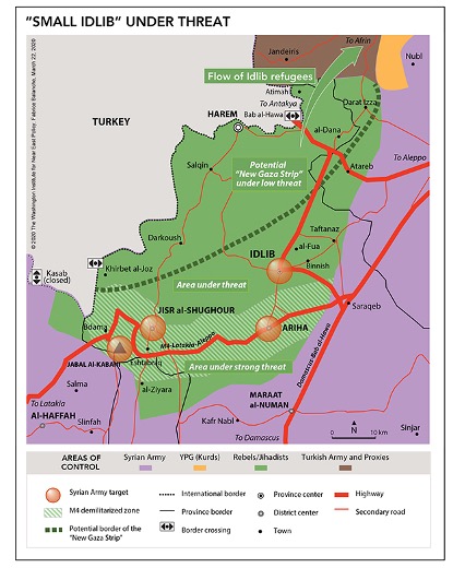 The Washington Instute’de 2020’de yayınlanan Fabrice Balanche imzalı analizde yayınlanan Küçük İdlib haritası. Analizin başlığı ise manidar:  Idlib May Become the Next Gaza Strip  (İdlib, Bir Sonraki Gazze Şeridi Olabilir)