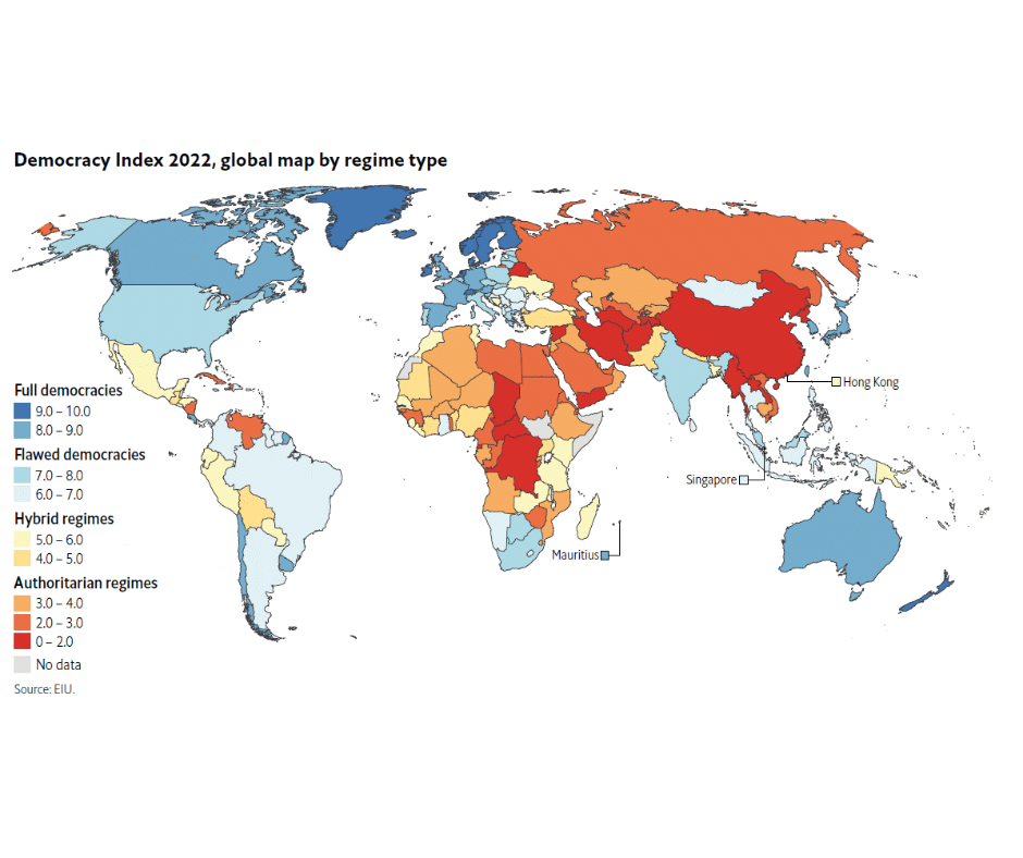 Demokrasi denince de The Economist’in haberalma birimi (Economist Intelligence Unit) tarafından hazırlanan demokrasi endeksi (https://www.eiu.com/n/campaigns/democracy-index-2022/?utm_source=economist&utm_medium=daily_chart&utm_campaign=democracy-index-2022) akla geliyor.
