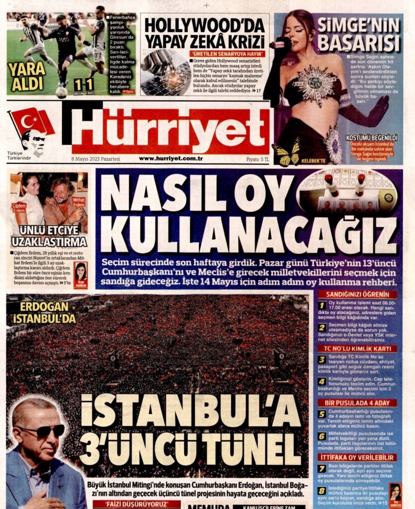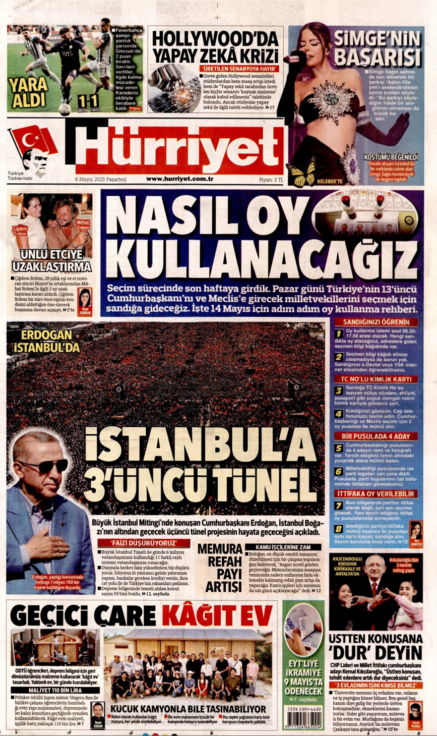 Hürriyet, “Nasıl oy kullanacağız” manşetiyle çıktı ve manşet haberinde oy kullanma rehberi yayımladı. Manşetin hemen altında Erdoğan’ın İstanbul mitingine yer veren gazete, İmamoğlu’nun Erzurum mitingine saldırıyı birinci sayfadan görmedi.
