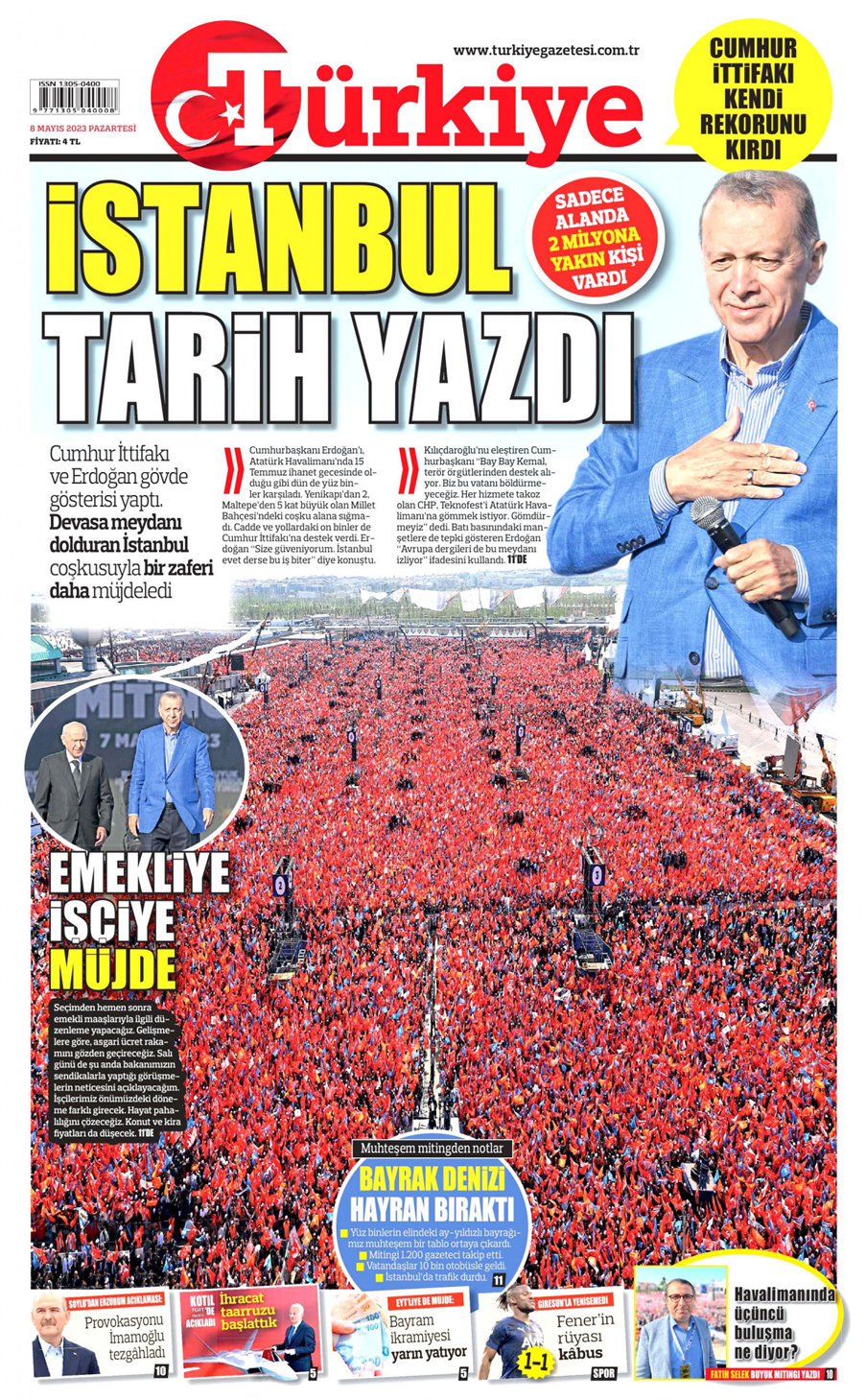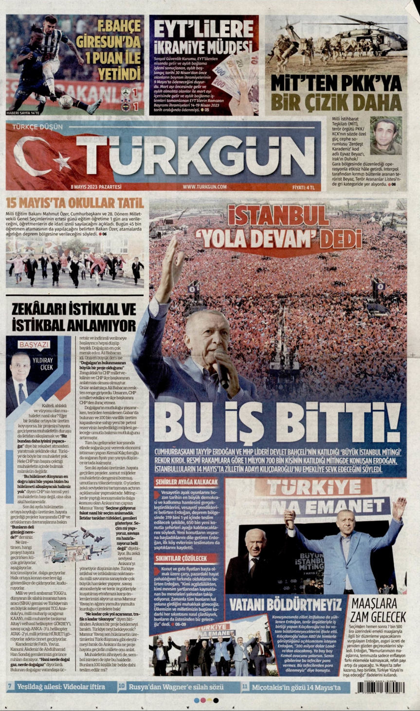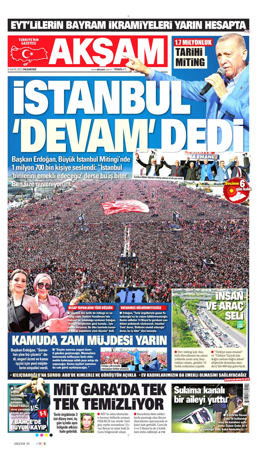 Türkiye de birinci sayfasının neredeyse tamamını Erdoğan’ın İstanbul mitingine ayırdı. Birinci sayfada Erdoğan’ın mitingi dışında yalnızca en alt sırada dört küçük haber anonsu yer aldı.