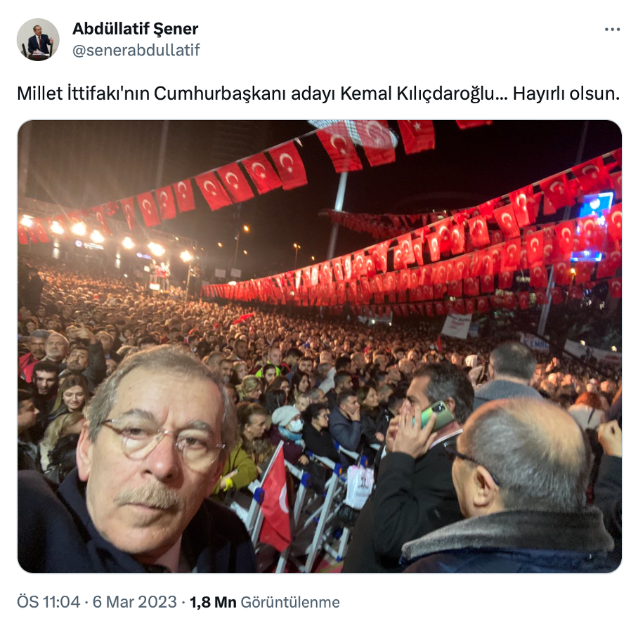 AK Parti kurucularından, eski Maliye Bakanı, 2015 yılında CHP’ye katılan ve 2018’de Konya’dan CHP milletvekili seçilen, son seçimde aday gösterilmeyen Abdülatif Şener, Halk TV’de açıkladı: “İlk turda Sinan Oğan’a oy verdim, ikinci turda geçersiz kullandım.” Şener, seçim kampanyası boyunca Kılıçdaroğlu’na destek açıklamaları yapmış, CHP tarafından gönderildiği Belçika’da Kılıçdaroğlu için seçim çalışması yapmıştı.