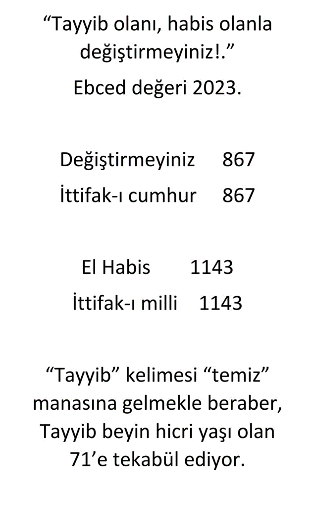 Propaganda için ebced hesapları da devrede. Hesabın sonunda mutlaka iktidarın değişmemesi gerektiği sonucu çıkıyor.