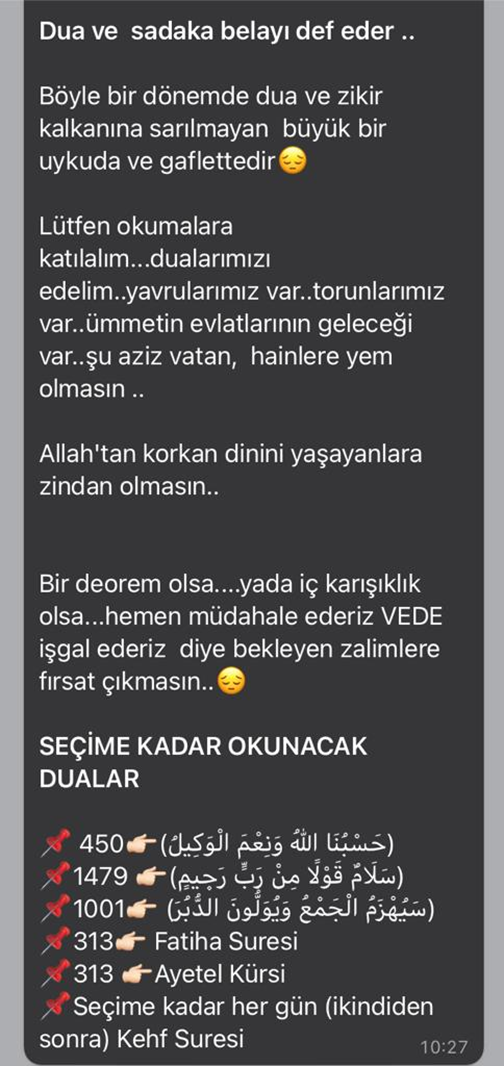 Seçimin son günlerinde muhafazakâr WhatsApp gruplarında Peygamber’in savaşlarda düşmanlarına karşı okuduğu dualar, ebced hesapları, Fetih sureleri devreye girdi. AK Parti seçmeni birbirine “CHP’nin zalimliğini” hatırlatıyor, oyların Bedir Savaşı’nda ok atarken sahabelerin ettiği duayla atılması isteniyor. Erdoğan-Abdülhamit benzetmesi içeren caps’ler de gözde etkinlikler arasında. Eleştiri oklarının hedefinde ise Saadet Partisi var.