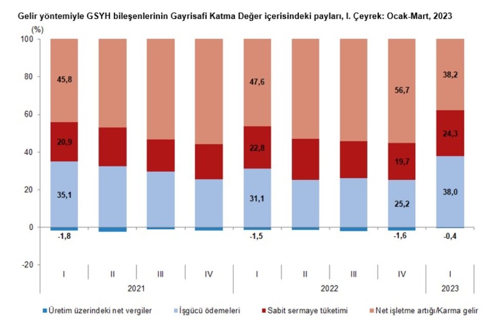 Ekonomist İris Cibre, sosyal medya hesabından bir grafik yayınladı. Bu grafiğe göre işgücü gelirlerinin gayri safi yurt içi hasıla (GSYH) içindeki payı 14 Mayıs seçimlerinden önce yıllık 6 puan arttı.