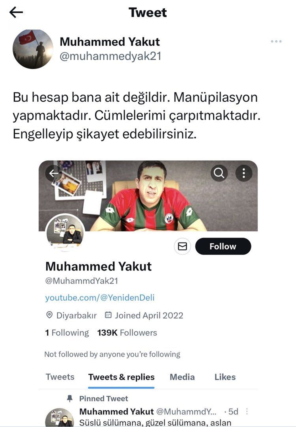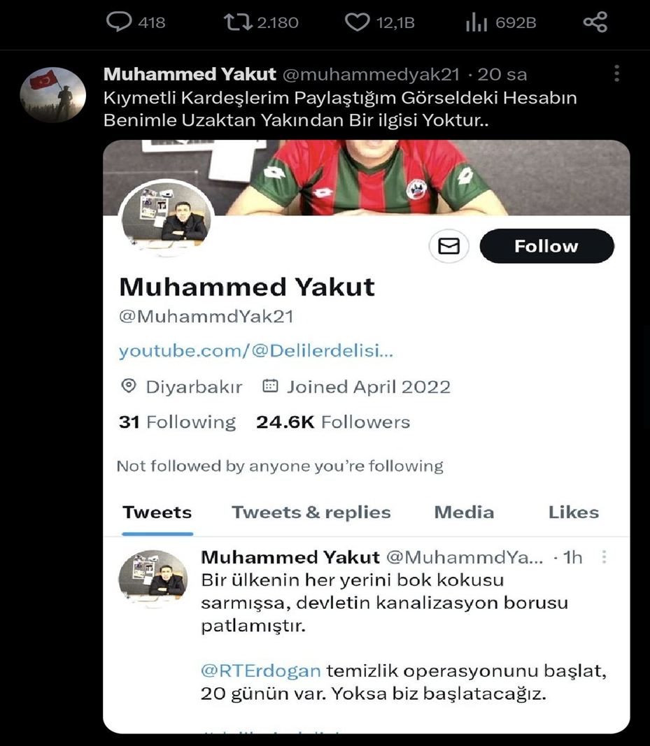 Muhammed Yakut da kendisi tarafından kullanıldığı bilinen Twitter hesabından bu hesabın sahte olduğunu ve kapatılması amacıyla şikâyet etmeye çağıran paylaşımlar yapmıştı:
