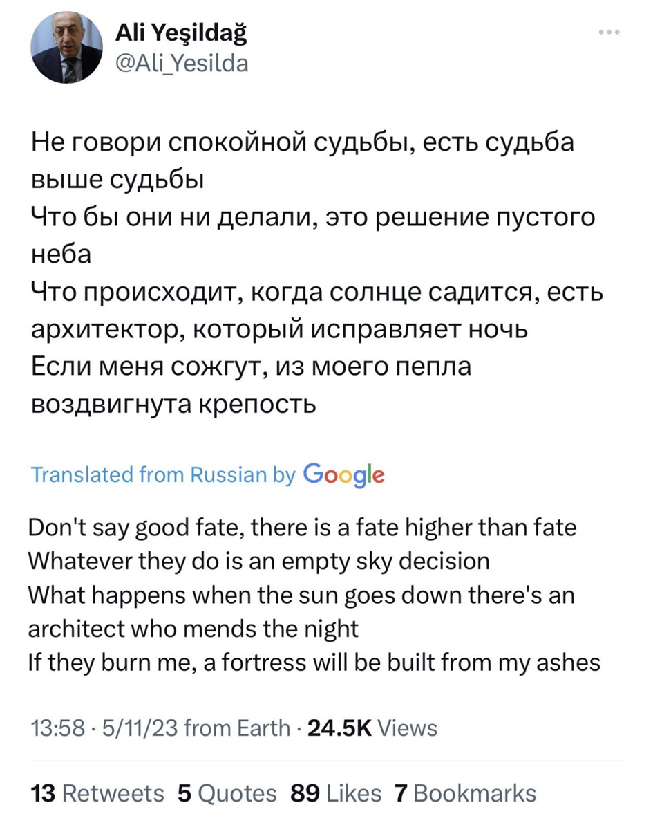 Tweet’te, Şair Sezai Karakoç’un, Erdoğan tarafından çok sevilen “Sakın kader deme kaderin üstünde bir kader vardır / Ne yapsalar boş göklerden gelen bir karar vardır / Gün batsa ne olur geceyi onaran bir mimar vardır / Yanmışsam külümden yapılan bir hisar vardır” dizeleri Rusça olarak paylaşıldı.