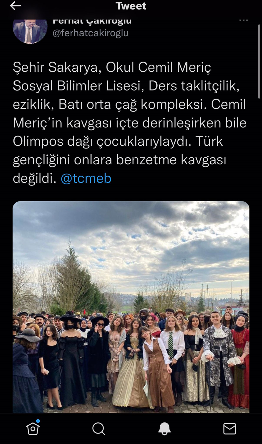Çakıroğlu, sosyal medya hesabından yaptığı paylaşımda etkinliği ‘Batı özentiliği’ yapmakla suçladı ve Milli Eğitim Bakanlığı’nın sosyal medya hesabını etiketleyerek şu ifadeleri kullandı: