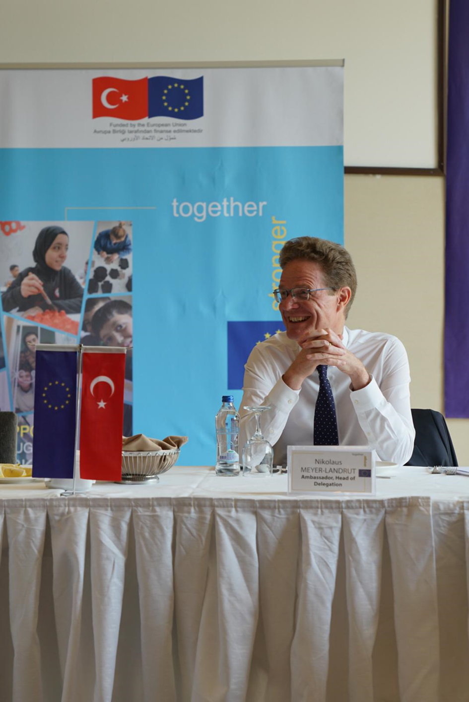 Hem Türkiye’de hem Avrupa’da, Türkiye-AB ilişkilerinde en sorunlu konuların başında görülen Suriyelilerin Türkiye’deki yaşamlarının iyileştirilmesi, yerel halkla birlikte yaşamalarının kolaylaştırılması için AB’nin Türkiye’ye verdiği proje desteklerindeki gelişmeleri AB Türkiye Delegasyonu Başkanı, Büyükelçi Nikolaus Meyer-Landrut’la Şanlıurfa’da gözlemleme, yerel yöneticilerden de bilgi alma fırsatı yakaladık.