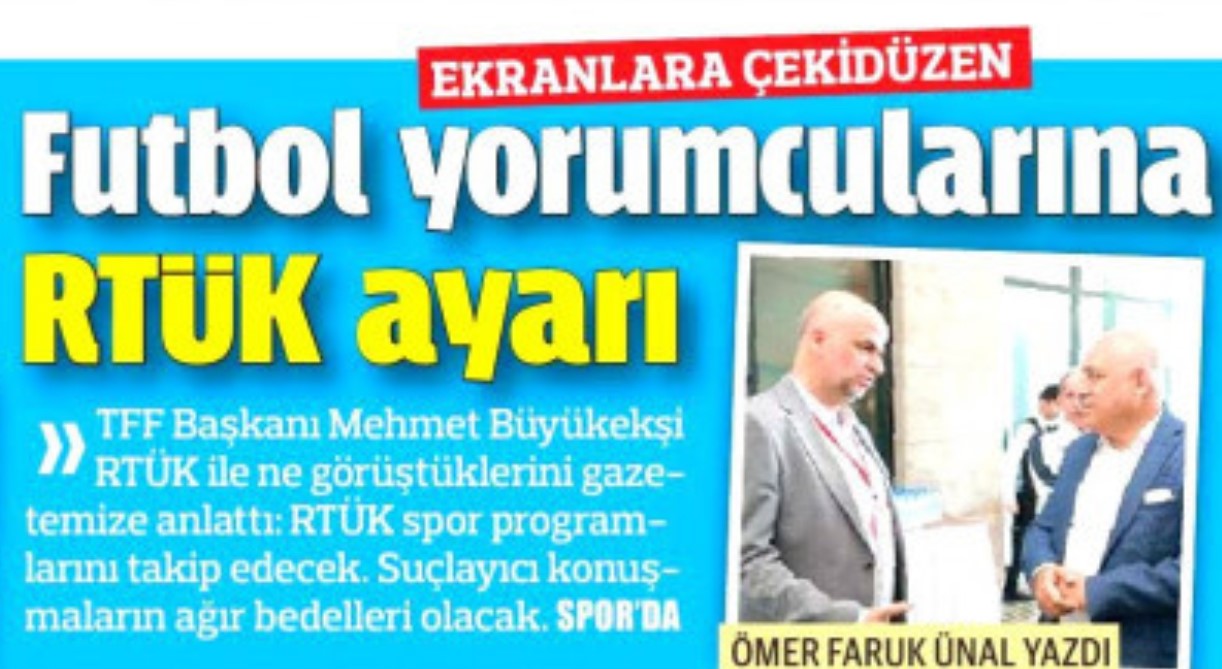 - Türkiye gazetesinden Ömer Faruk Ünal’a konuşan TFF Başkanı Mehmet Büyükekşi, RTÜK’ün spor programlarını daha sert bir şekilde denetleyeceğini söyledi: “Suçlayıcı konuşmaların ağır bedelleri olacak”