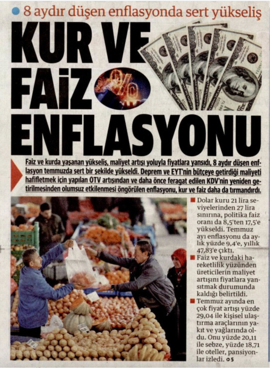 Mehmet Şimşek’in ‘piyasa beklentileri ile uyumlu’ dediği dün açıklanan enflasyon oranlarını Yeni Şafak “8 aydır düşen enflasyonda sert yükseliş” başlığı ile verdi. Gazete, “Kur ve faiz enflasyonu” diyerek Şimşek ve ekibinin politikalarına gönderme yaptı.
